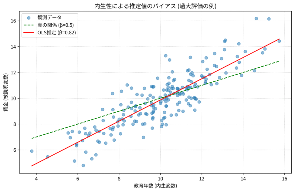 この場合、OLSは教育年数の効果を過大評価してしまいます。なぜなら、OLSが推定した係数には、教育年数そのものの効果だけでなく、教育年数と相関する「能力」の効果までが上乗せされてしまうからです