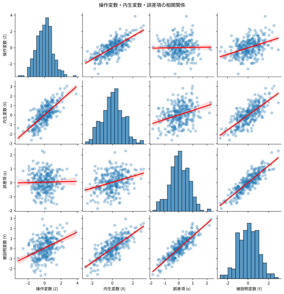 図:ZとXは相関があるが、Zと$\epsilon$は相関がない様子を示す散布図行列