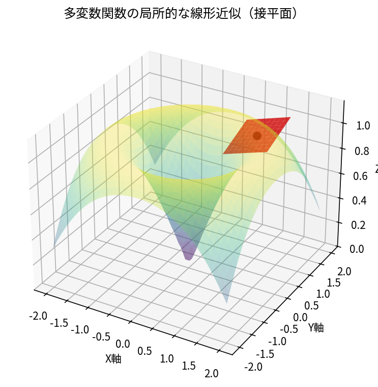 この図は、3次元空間における曲面(多変数関数)と、その一点における接平面を示しています。ヤコビ行列は、この接平面の傾きを決定し、関数がその点でどのように振る舞うかを線形的に近似する役割を担っています。