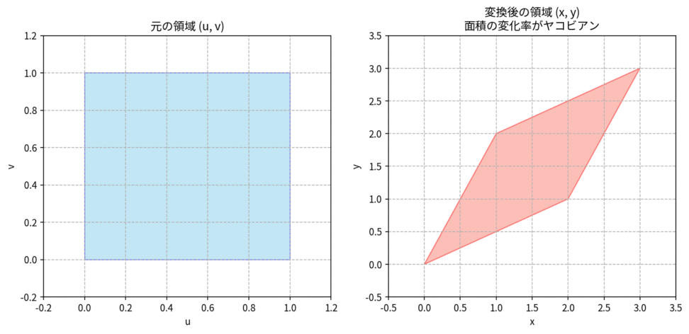 ヤコビアンが使える場面の一つが、多重積分における置換積分です。1変数関数の置換積分では、変数を変換する際に $dx = g'(u) du$ のように $g'(u)$ を掛けて補正しました。