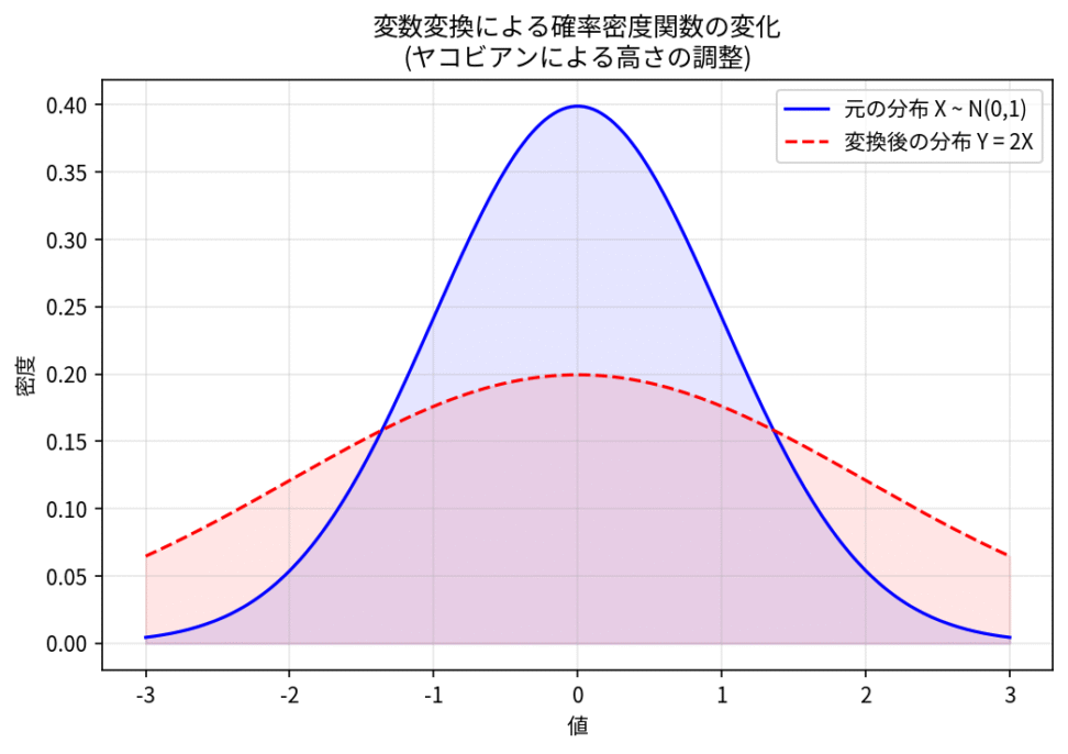 この図は、確率密度関数が変数変換によってどのように変化するかを示しています。元の分布(青)が、ある変換によって別の分布(赤)に変わっています。ヤコビアンは、この変換によって確率の「密度」が薄まったり濃くなったりする度合いを調整し、確率の総和が常に1に保たれるように補正します。