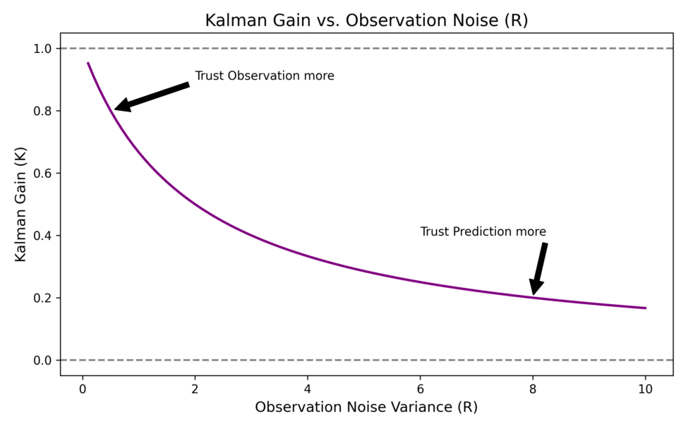 カルマンゲイン $K_t$ は、「予測の不確実性」と「観測の不確実性」の比率によって決まります。観測ノイズ $R$ が非常に大きい場合、カルマンゲインは小さくなり、フィルタは観測値をあまり信用せずに予測値を重視します。逆に、観測が非常に正確であれば、カルマンゲインは大きくなり、観測値に基づいて大胆に予測を修正します。