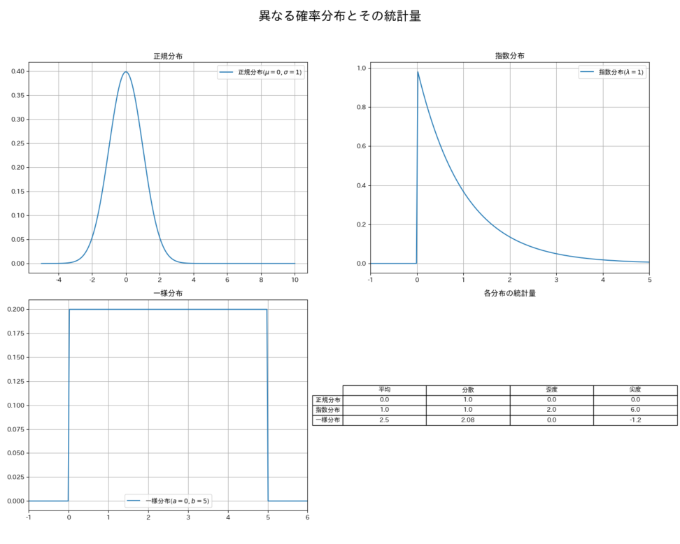 数式だけだとイメージしづらいので、正規分布と指数分布、一様分布の平均、分散、歪度、尖度を可視化してみました。