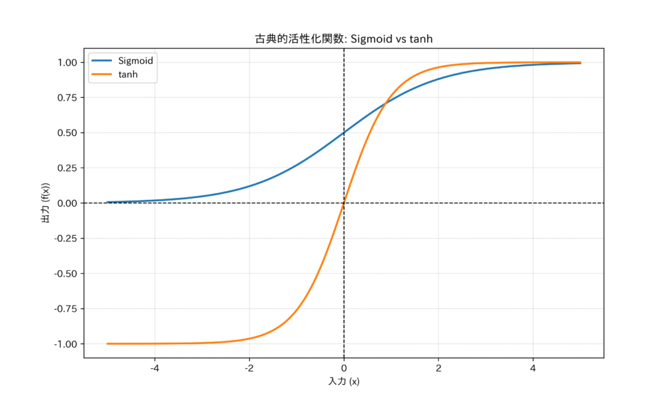 tanh関数の出力範囲は-1から1です。このゼロ中心であるという特性が、学習効率の向上に寄与します。シグモイド関数は出力が常に正(0から1)であるため、勾配も常に同じ符号(正)になり、重みの更新方向が偏ってしまうという問題がありましたが、tanhは正負の出力を持つため、この問題は緩和されました